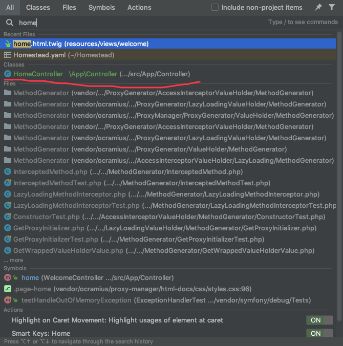 当文件少的时候还好,但是文件比较多目录比较深的时候找起来还是比较麻烦,更好的办法是让 phpstorm 来帮我们找。