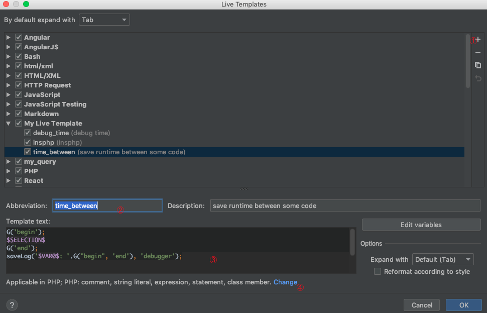 我有时候需要记录一下一段代码的执行时间到日志,每次都写觉得比较麻烦,所以我准备定义一个模板。Settings->Editor->Live Templates